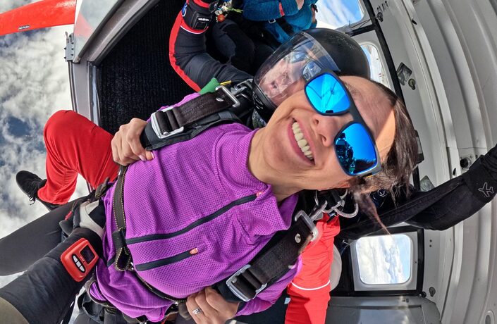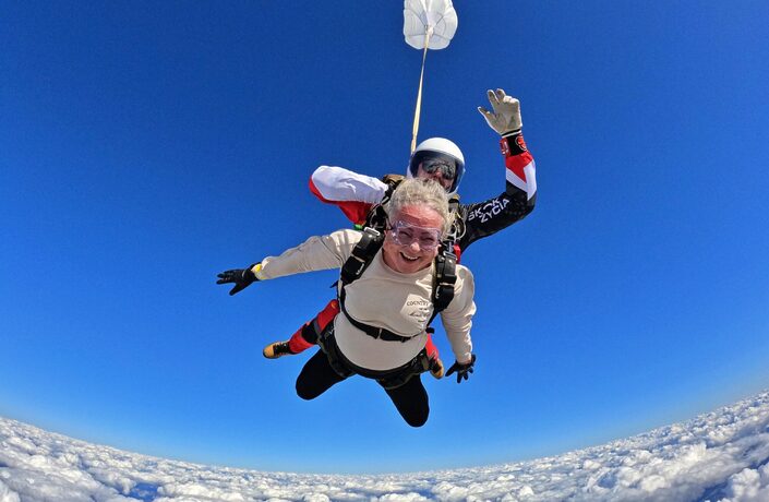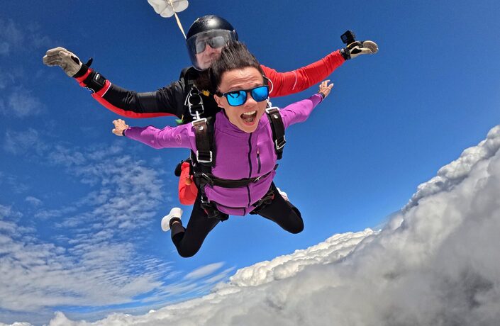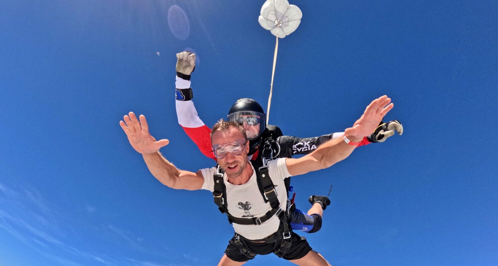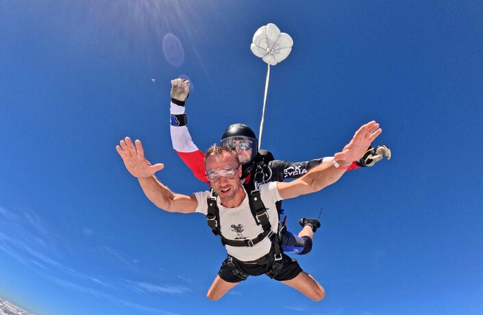 Twój pierwszy skok odbędzie się w tandemie, co to oznacza? To, że jesteś przypięty do doświadczonego instruktora (który ma na swoim koncie co najmniej 1000 skoków) więc nie musisz się martwić o jakiekolwiek błędy, oznacza to również że on lub ona wykona całą ciężką pracę za Ciebie. A tobie pozostanie cieszenie się prędkością przekraczającą 200 km/h i podziwianiem widoków po otwarciu czaszy spadochronu.